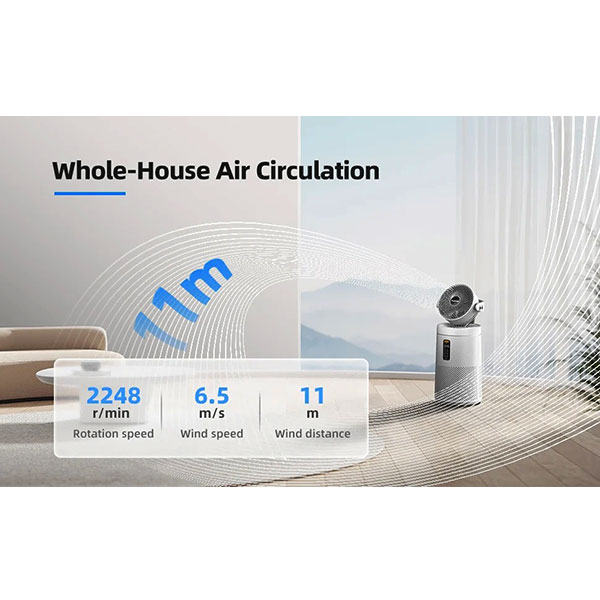 دستگاه تصفیه هوا و پنکه چرخشی گریمن GR-AP700 با فناوری پوشش ۳۶۰ درجهای هوای پاک گریمن، هوای تمیز را در هر گوشه خانهتان احساس کنید. این دستگاه با استفاده از سیستم خروجی هوای مارپیچی (Spiral Air Outlet)، جریان مداوم و یکنواختی از هوای تصفیهشده را تا شعاع ۱۱ متر (۳۶ فوت) در فضا پخش میکند و مساحتی بیش از ۱۸۴ متر مربع (۱۹۸۰ فوت مربع) را بهطور کامل تحت پوشش قرار میدهد. موتور Brushless DC با فرکانس متغیر و پرههای توربو، حجم هوایی معادل ۱۰۱۷ فوت مکعب در دقیقه (CFM) تولید کرده و جریان هوا را با سرعت بالا و صدای بسیار کم در فضا به گردش درمیآورد.