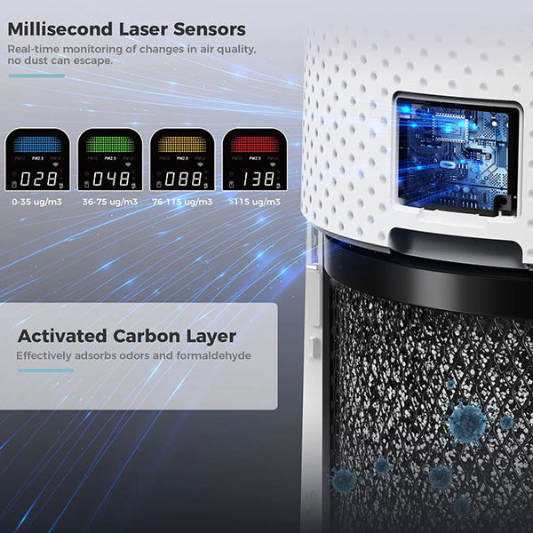 به کمک سنسورهای PM1 و PM2.5، دستگاه قادر است کوچکترین ذرات معلق را شناسایی کند. نمایشگر هوشمند و اپلیکیشن اختصاصی، کیفیت هوا را بهصورت زنده (Real-Time) نشان میدهند و تغییرات کیفیت را در لحظه به شما اطلاع میدهند.