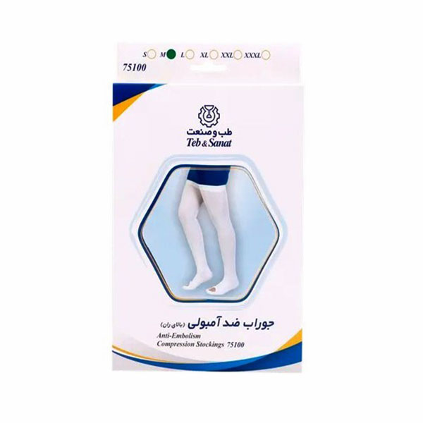 جوراب ضد آمبولی بلند طب و صنعت مدل 75100 – بالای ران با بهرهگیری از فناوری بافت فشاری پزشکی و الیاف کشسان باکیفیت بالا، بهمنظور پیشگیری از تشکیل لخته خون (آمبولی) در عروق اندام تحتانی طراحی شده است.