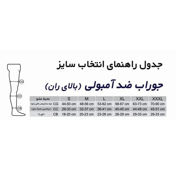 جدول مشخصات جوراب ضد آمبولی بلند طب و صنعت مدل 75100 – بالای ران