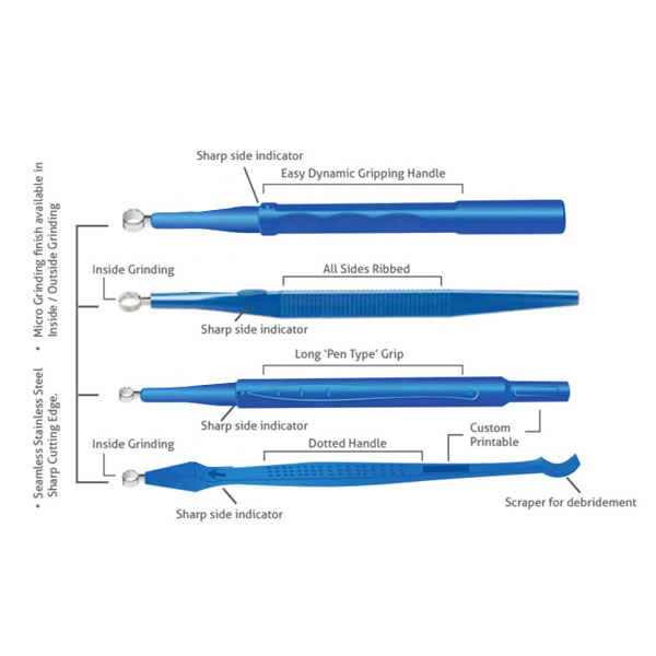 تنوع اندازهها و طراحیهای مختلف دسته (از نوع DCS با دسته ساده تا DCP با طراحی قلمی و DDC با درپوش محافظ) این امکان را میدهد که پزشک متناسب با محل و نوع ضایعه ابزار مناسب را انتخاب کند.