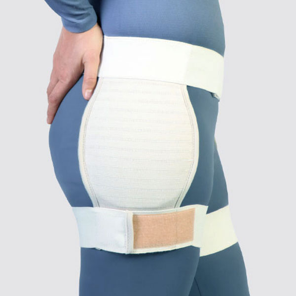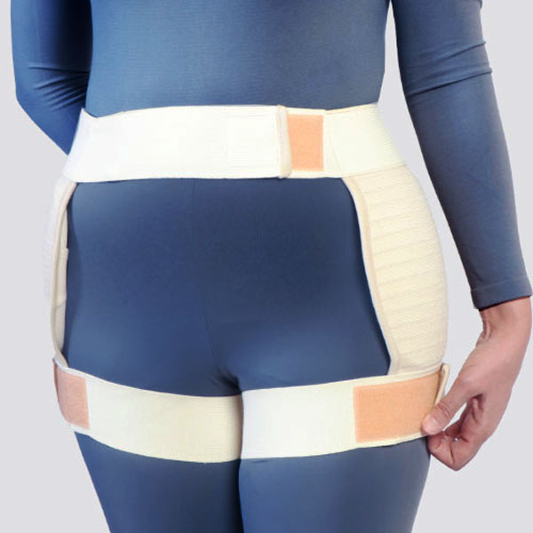 - کشها را با استفاده از چسبکهای پشت و جلو به دور کمر خود بگونهای ببندید که پدهای لگنی بصورت متقارن در دو طرف لگن قرار بگیرند و برجستگیهای مفصل ران را کاملاً پوشش دهند
